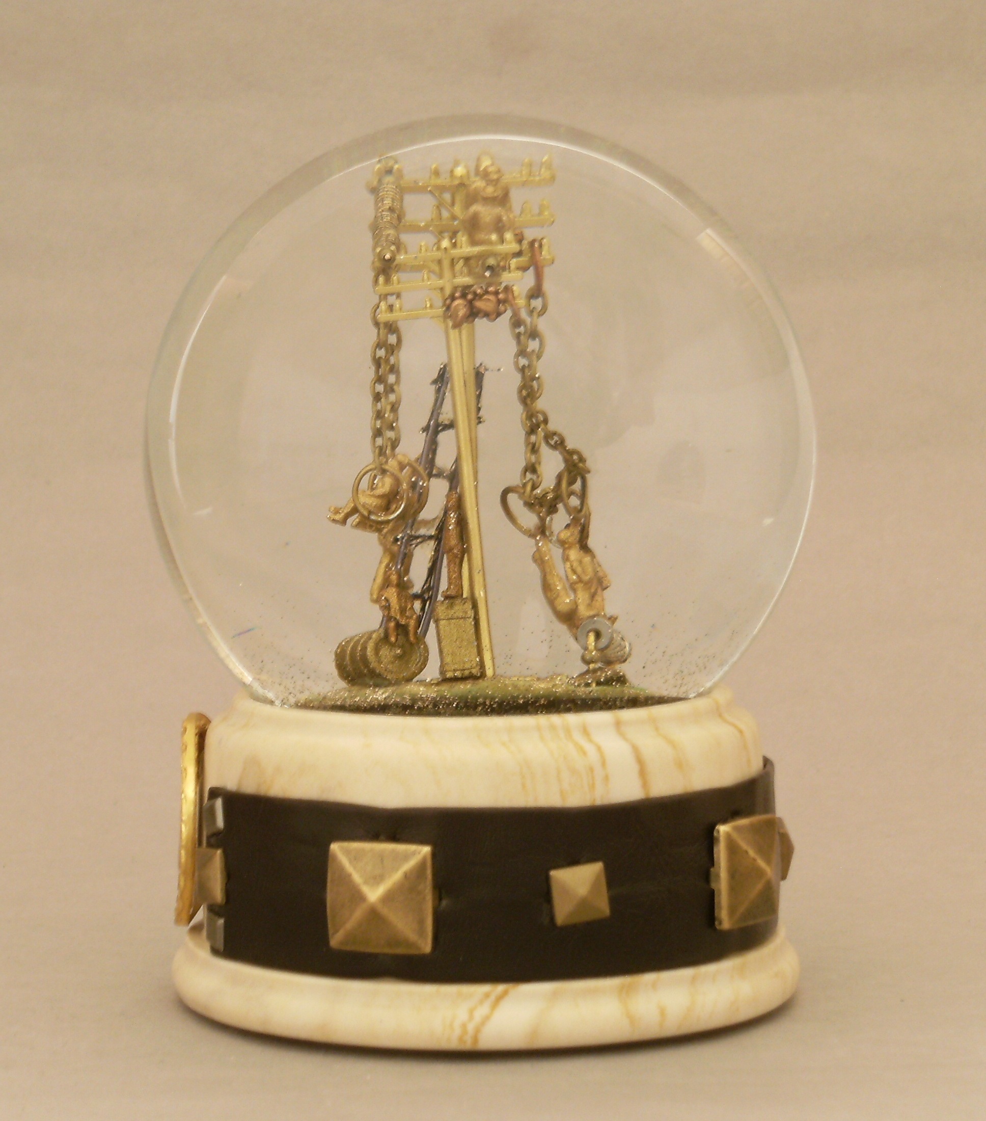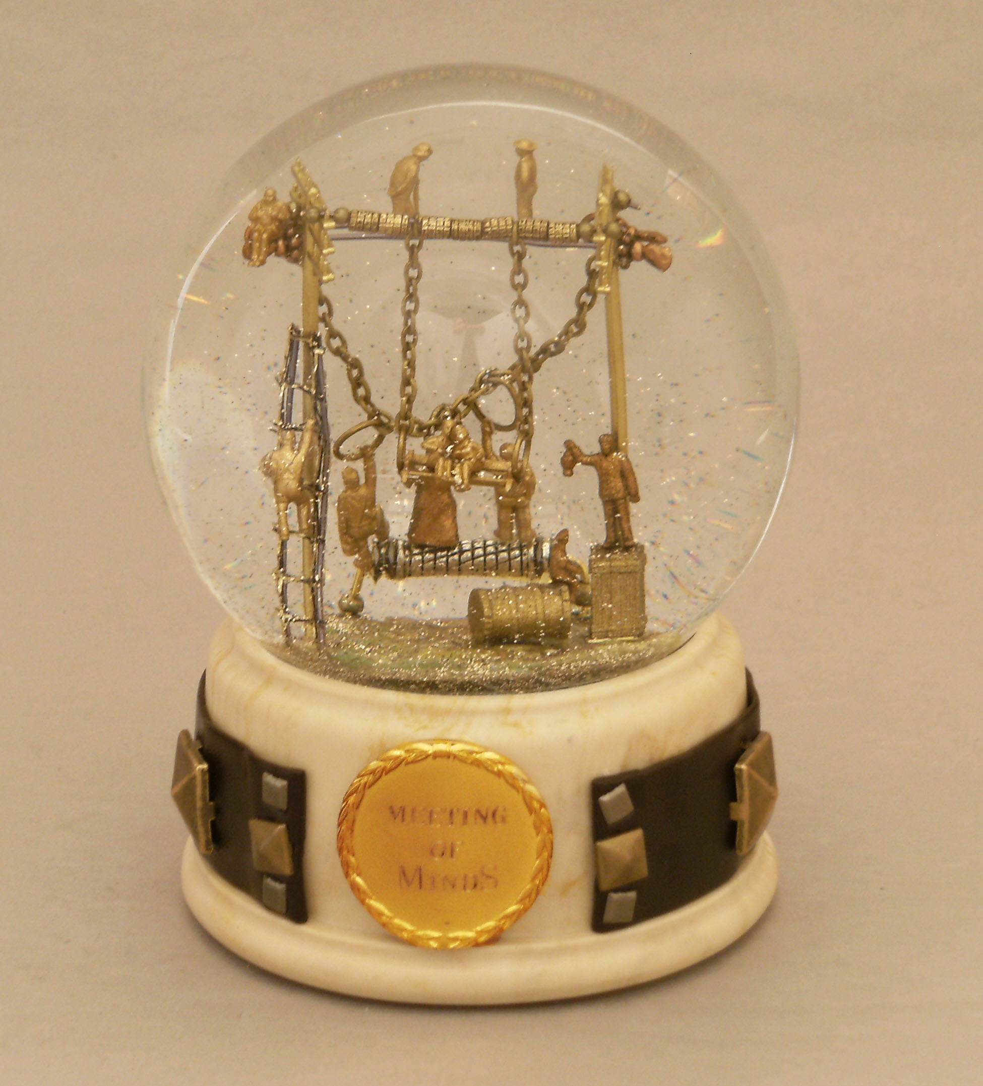 This waterglobe evolved, as so many do, with a single thought followed by second and third interpretations. A “Meeting of Minds” is just that: hearing another person’s thoughts, listening, reacting. Whether the meeting proves to be life-changing, or just a forgotten moment, those times matter when we don’t pass like ships in the night, but hear and consider each other’s point of view. Watching from our vantage point outside their world, we never know if the people we see are in agreement, making amends, planning their future, or perhaps saying goodbye.