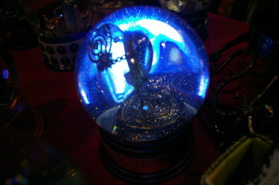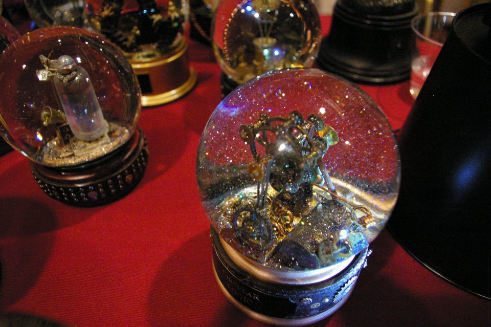 We used the Sacramento Steampunk Society’s logo and the SSS group photo inside the snowglobe (logo design courtesy Chance Von Bekke), added riveted leather straps with gears and timepieces, to work with the dark and mysterious logo, featuring a steampunk airship hovering over the California State Capitol.