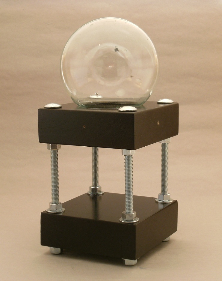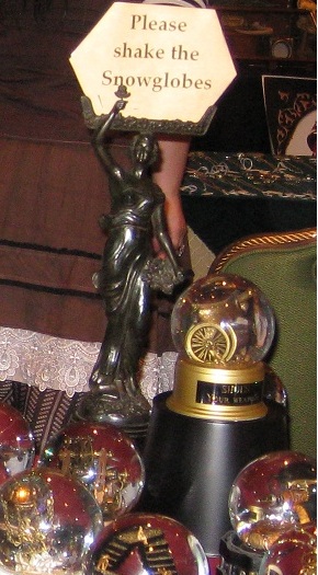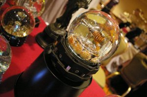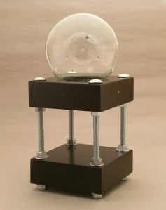 I felt my snowglobes (about 6″ tall and 4″ wide) were too small to make an impact on a busy table with buttons, brochures, ribbons and photos, but it occurred to me to make the base larger to give the snow globe more presence. I contacted the elusive snowglobe engineer (he who solves all problems snowgobe-related), and described what I wanted: a double base, supported with metal columns, and the snow globe riding above.