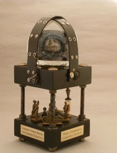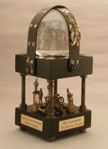 Well, next thing you know, I’ve got a steampunk artshow in San Jose (and members of the SSS were quite involved in putting Clockwork Alchemy together). Then I read a comment by the effervescent Alexander Watt Babbage that set my creative energy on “high.” All he said was, it sure would be nice if we had a piece of steampunk art or sculpture at our group table at the Con.