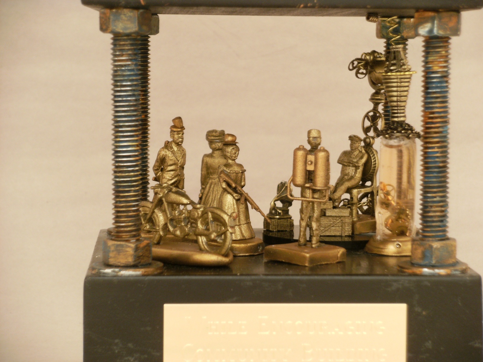 Next, we created a scene in the space between the upper and lower base, using tiny historical (with artistic liberties) figures. That scene includes a ray-gun-packing proper lady, a man relaxing in a time machine who looks suspiciously like Mr. Babbage in his Saturday cap, a traveler with a jetpack and a neo-Victorian couple conversing, both hiding weapons behind their backs. Here’s the finished piece, which also includes the Society’s motto on four separate brass plates wrapping each side of the base. Adding a jetpack to a figure just over 1-inch tall made me positively giddy.