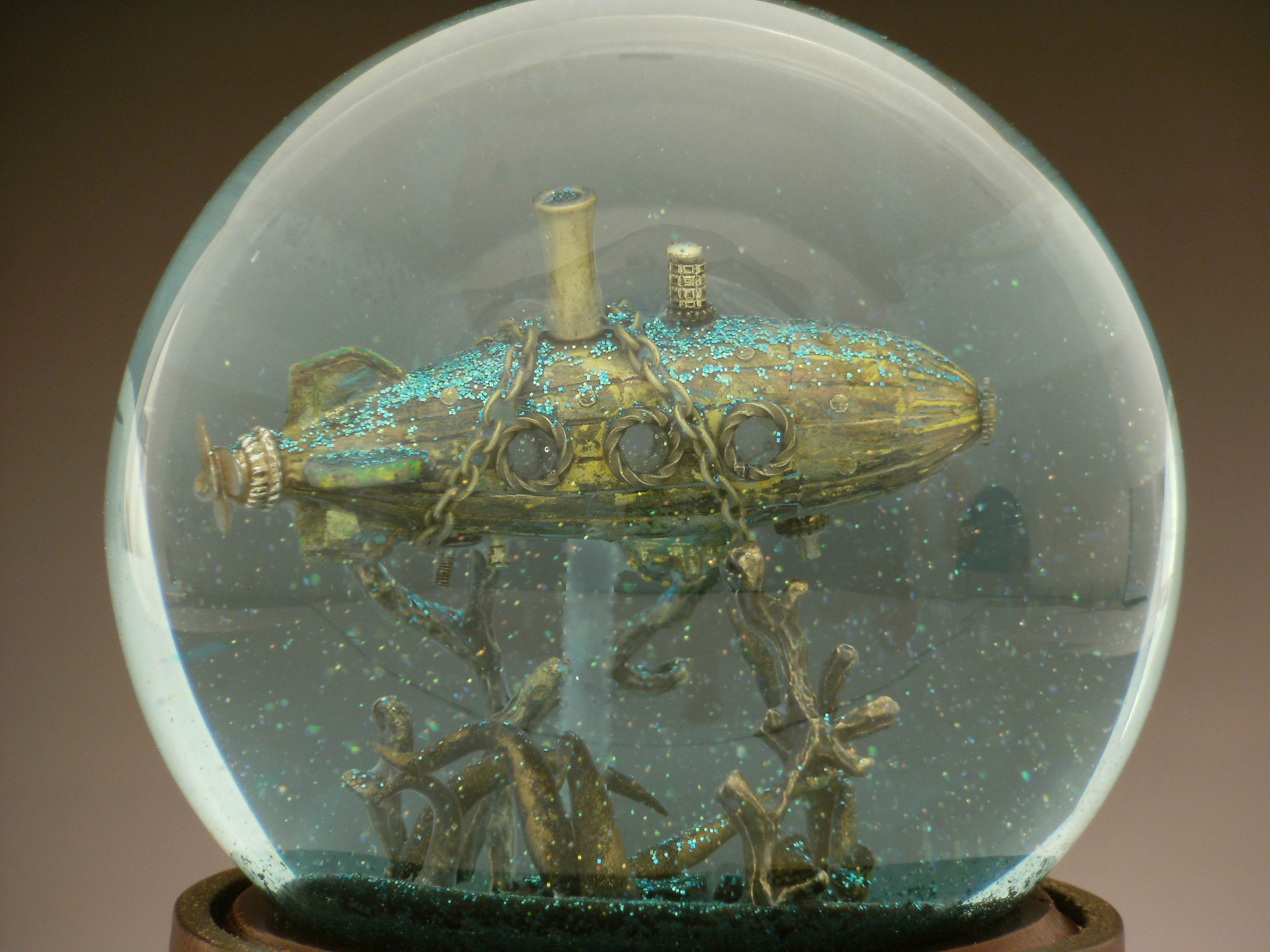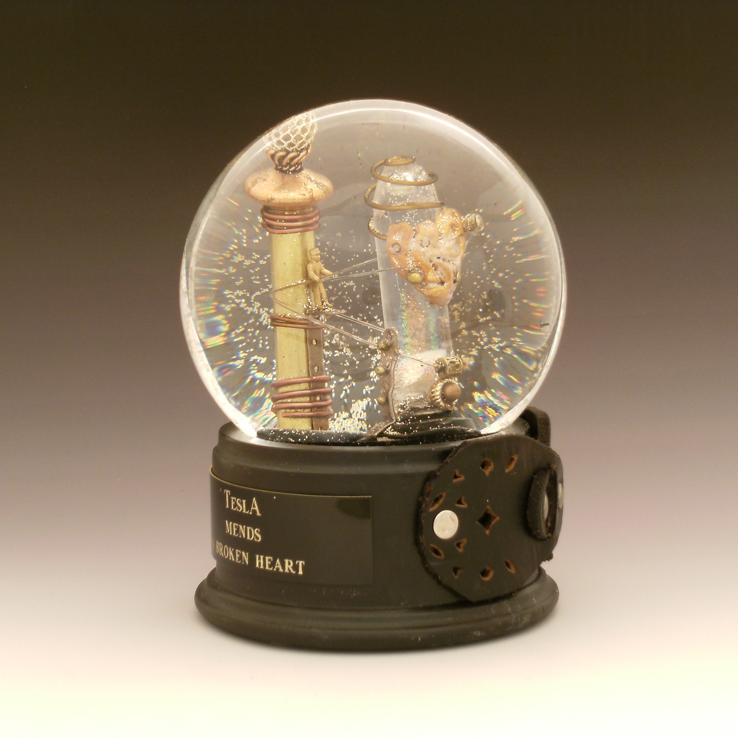 Magic Happens, one of a kind snow globe with glass heart, wire and beaded sculpture, silver dust and flecks inside liquid-filled glass ball. All images and designs copyright (c) 2014 Camryn Forrest Designs, Denver, Colorado.