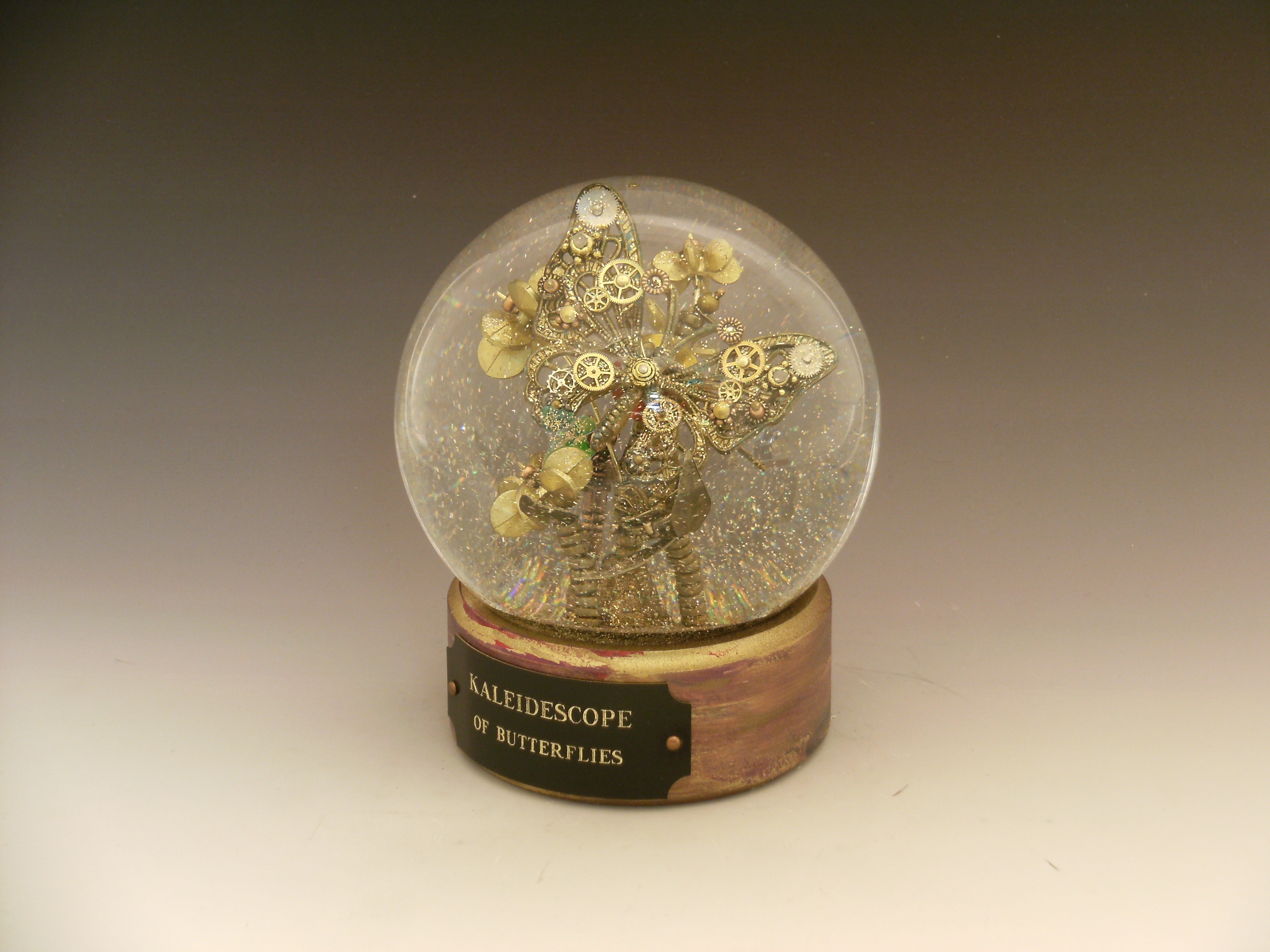 Remnants of Tesla, one of a kind snow globe sculpture, miniature tower created from repurposed vintage jewelry. When shaken, slivers of bright silver flecks give the appearance of liquid electricity and wireless energy. All images and design copyright (c) 2014 Camryn Forrest Designs, Denver, Colorado.