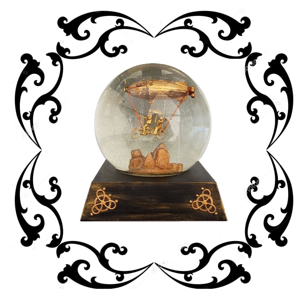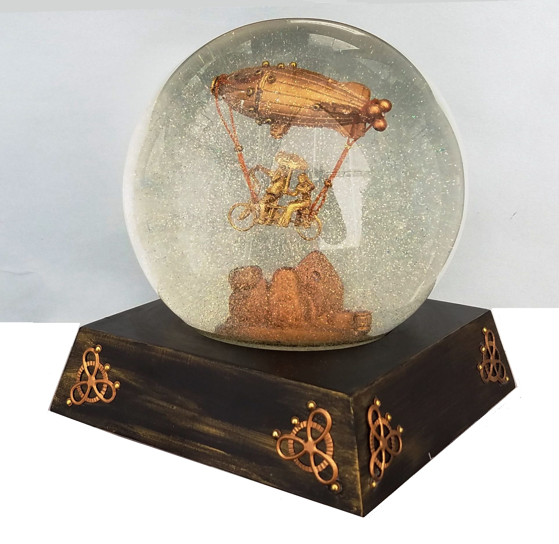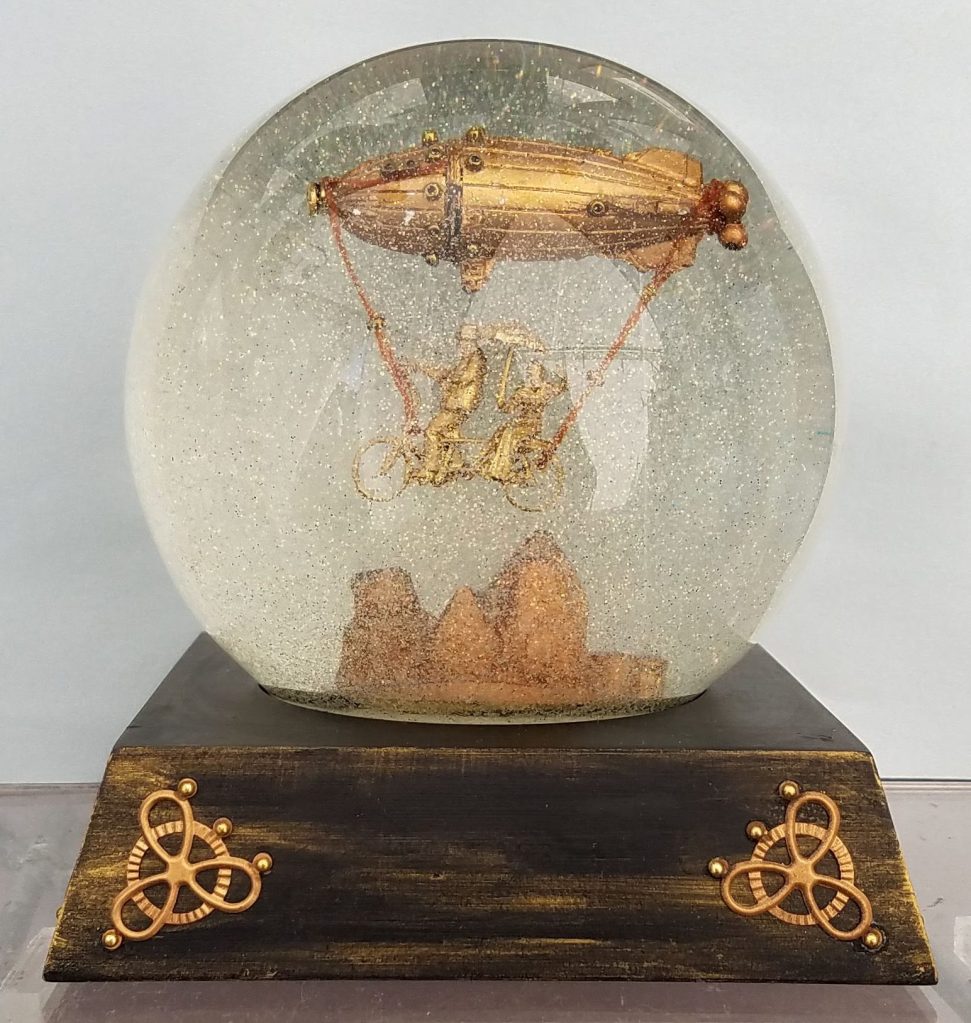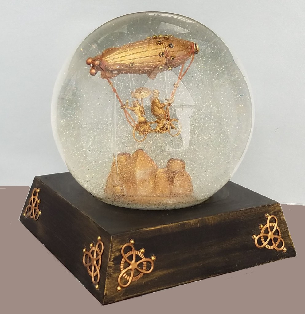 “A Zeppelin Built for Two” – one of a kind snow globe (sparkle globe) with a couple riding a bicycle built for two, underneath a stately airship in the sky. Sculpture: acrylic, wire, leather, metal and glass inside a glass globe. When shaken, the liquid-filled globe shimmers with mystic fog. Handpainted wooden base with metal embellishments. All images and designs copyright (c) 2021 Camryn Forrest Designs, Denver, Colorado USA.