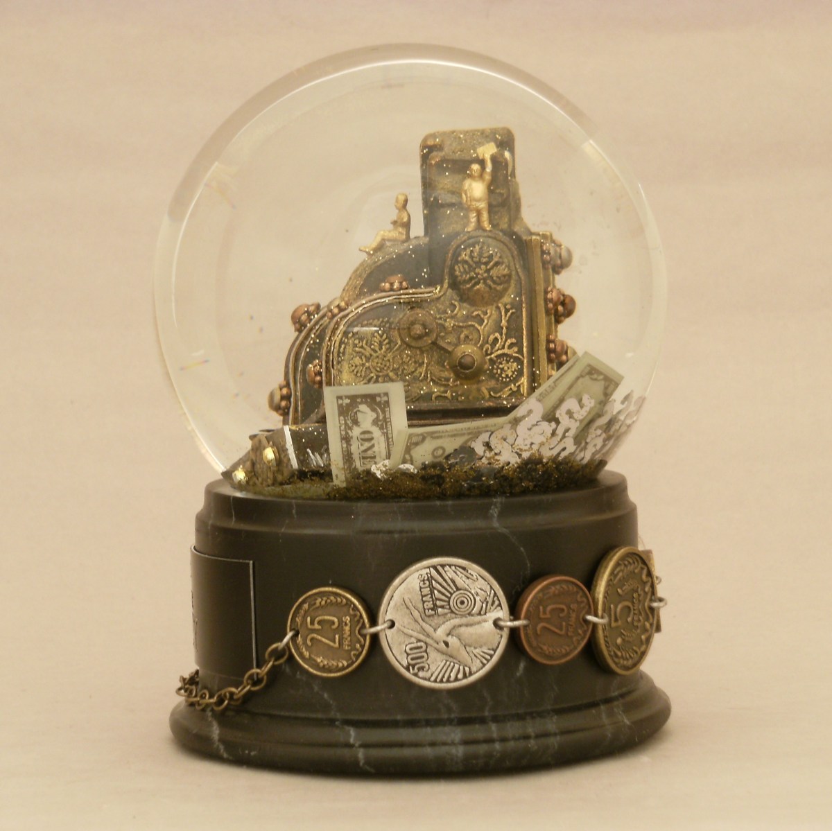 “Make a Little Money” one of a kind custom steampunk snow globe with antique cash register, floating dollar signs and dollar bills in liquid, and four tiny people sitting, standing and resting in the details of the machine. Camryn Forrest Designs, 2012.