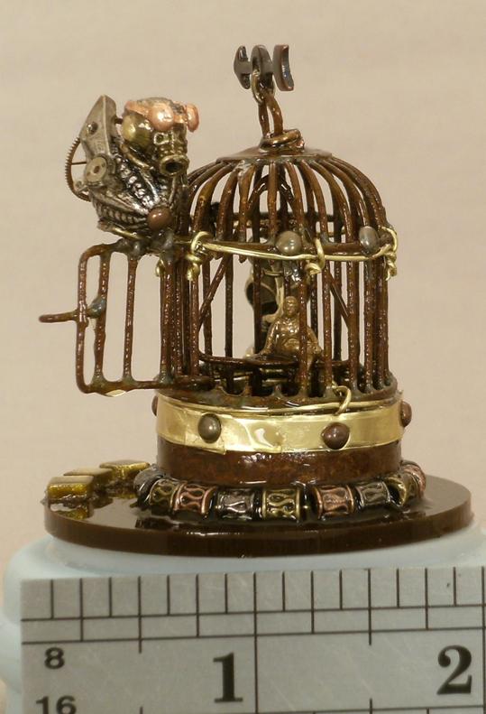 Then I take a look at the cage … seems so empty. But I don’t want another bird, and suddenly it strikes me, “why not put a person inside the cage, and have the bird outside?” Okay … but I have to work to get a tiny man who doesn’t look unhappy, because that’s not the point, he’s not a prisoner, he’s just in the cage by choice. It hits me: what would make me happy sitting inside an open bird cage? Music! So I add the tiny gramophone and I’m pleased.