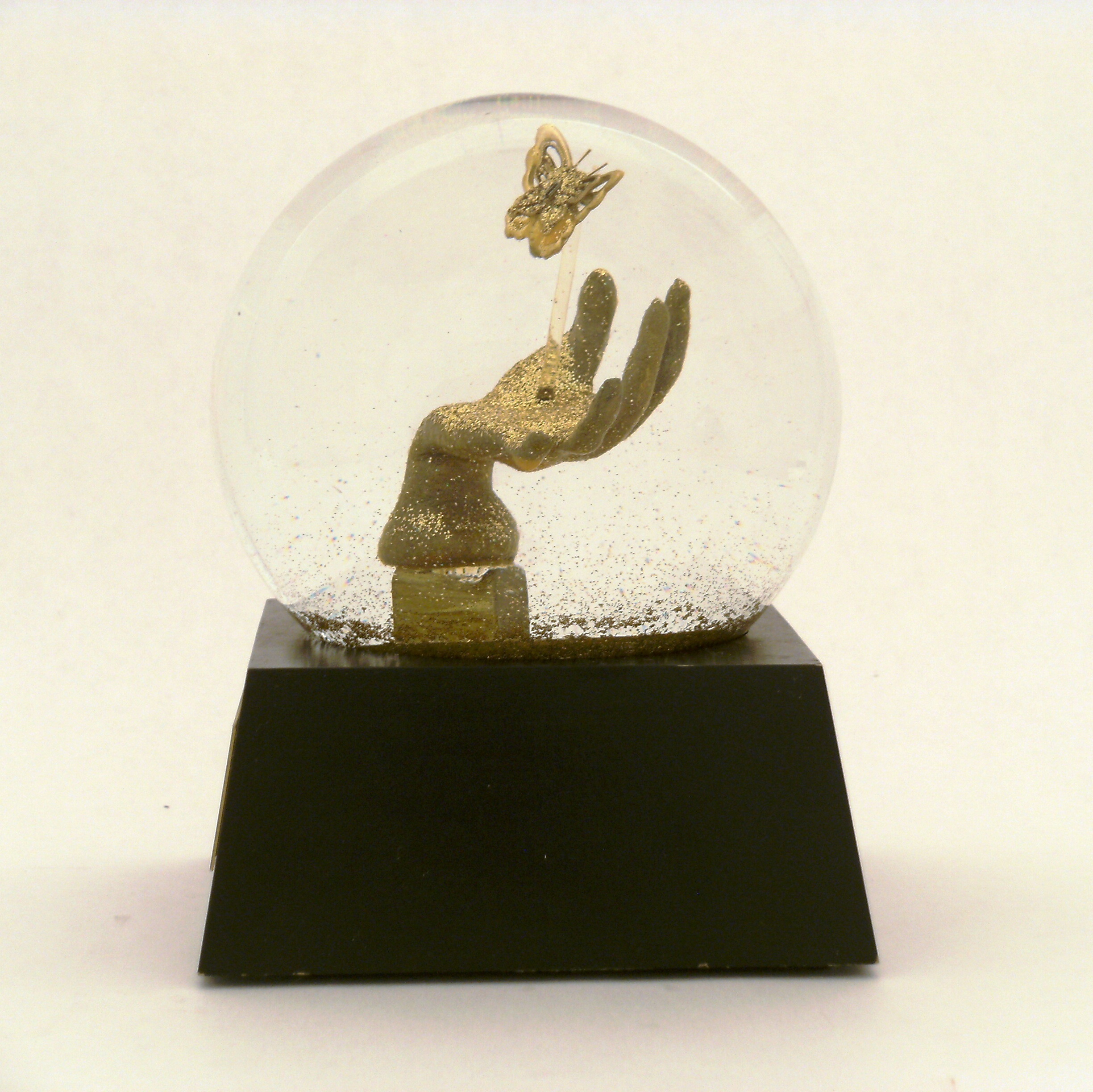 One of a kind snow globe (sparkle globe) with shimmering iridescent silver dust and glitter when shaken. Hand-painted acrylic base in shades of pewter, silver and gold, finished with two bunches of brass grapes and an engraved silver plate stating “Grapes of Raft.” The interior sculpture is cast clear resin with added iridescent flecks to increase the reflective properties under liquid, brass raft and green glass grapes holding tiny hammered brass raft paddles.