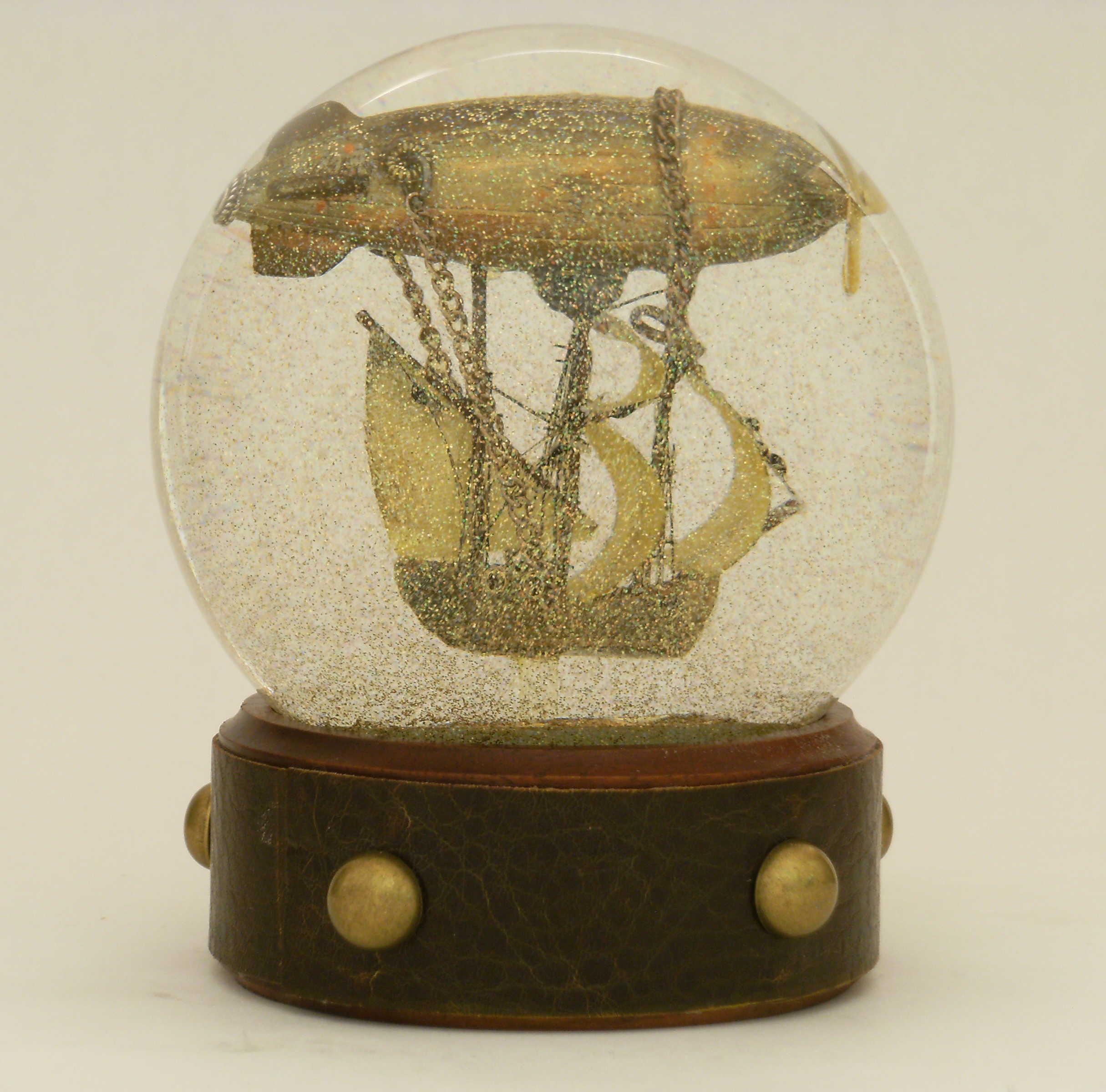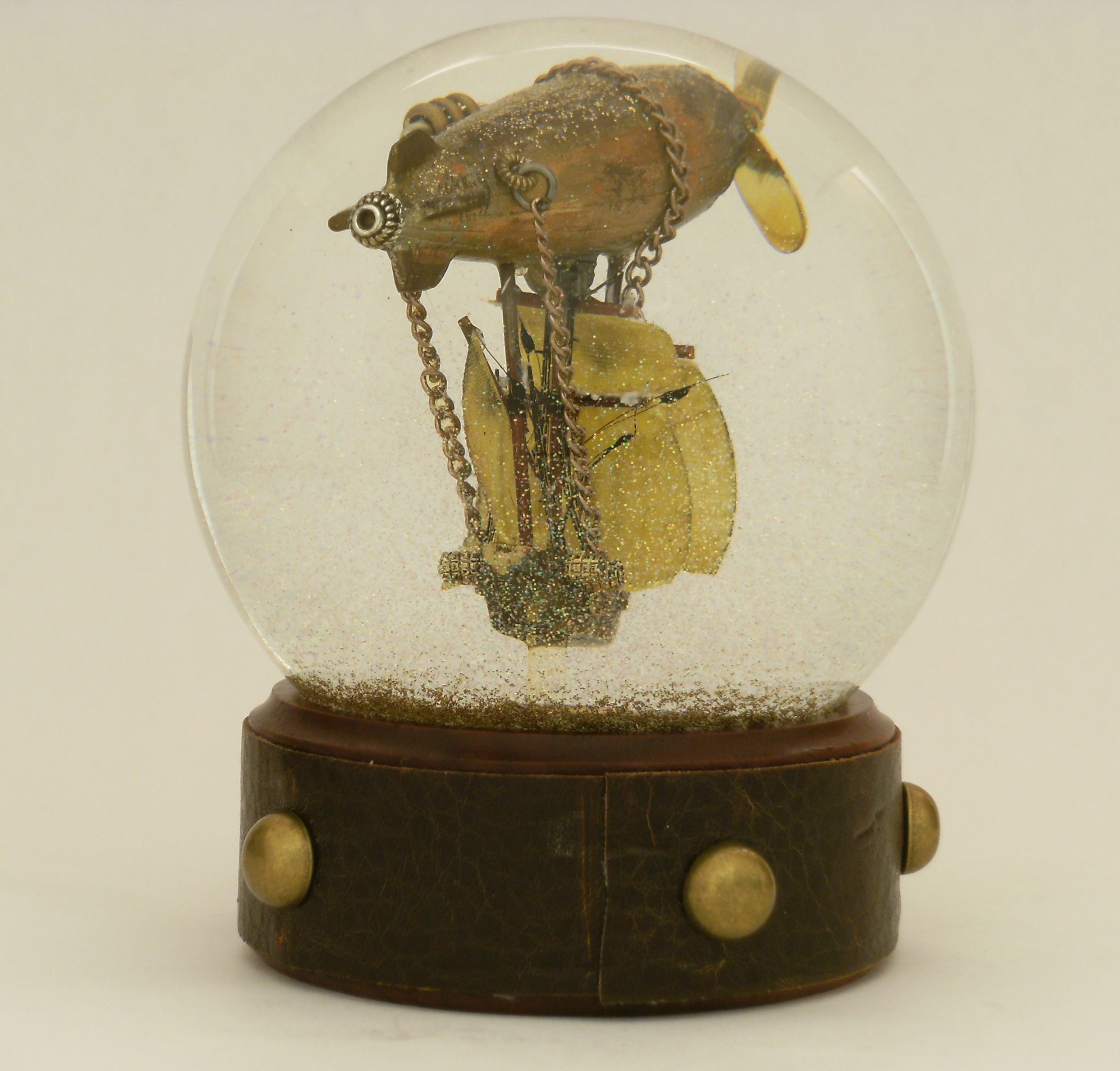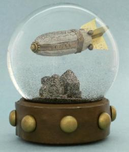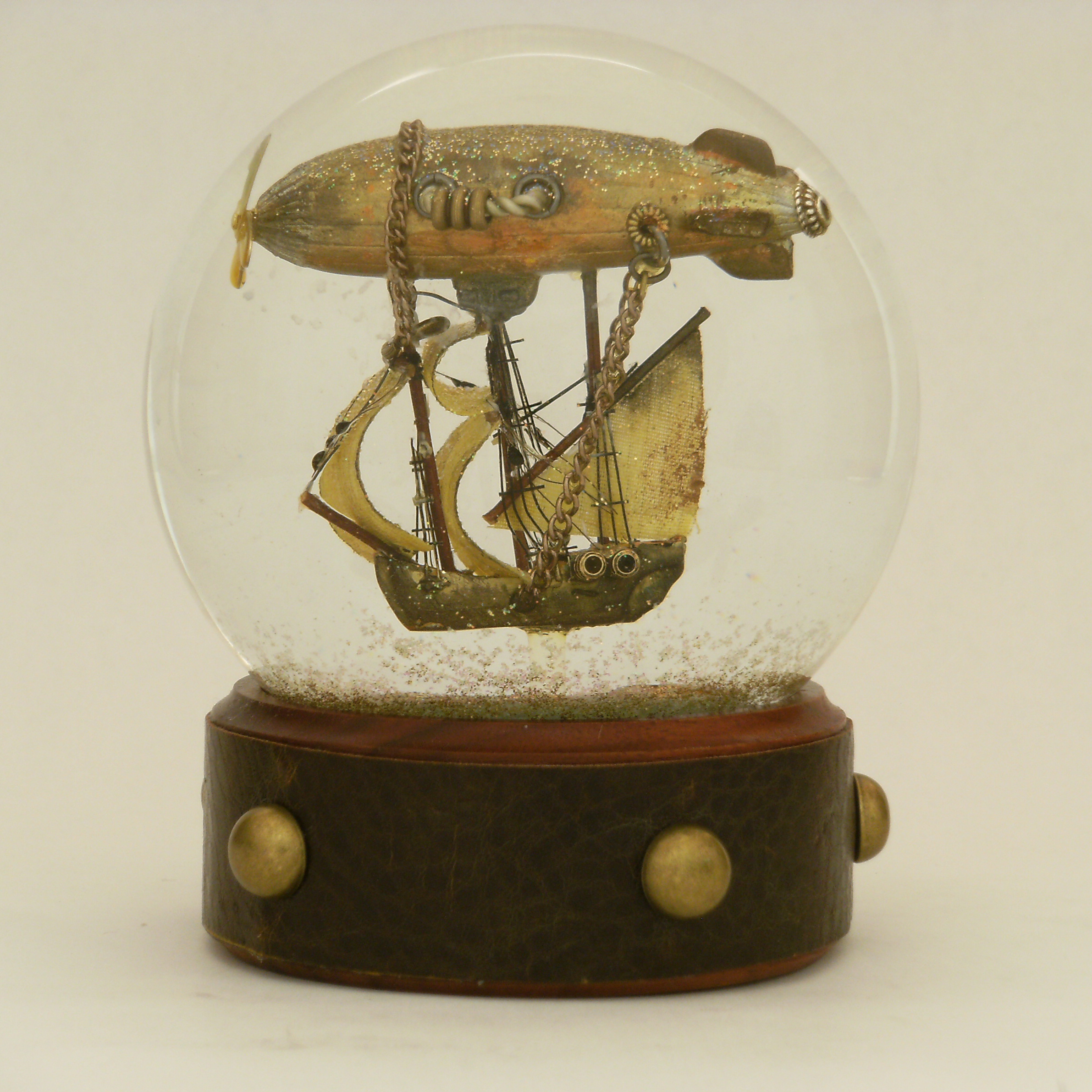 One of a kind snow/sparkle globe with airship and tiny figures hovering above the rooftops of a city, past or future. When shaken, the globe swirls with iridescent glitter dust, wrapping the scene in sparkling fog effects. Handpainted wooden base with brass embellishments and etched plate. All designs and photos are copyright (c) 2019 Camryn Forrest Designs, Denver, Colorado U.S.A.